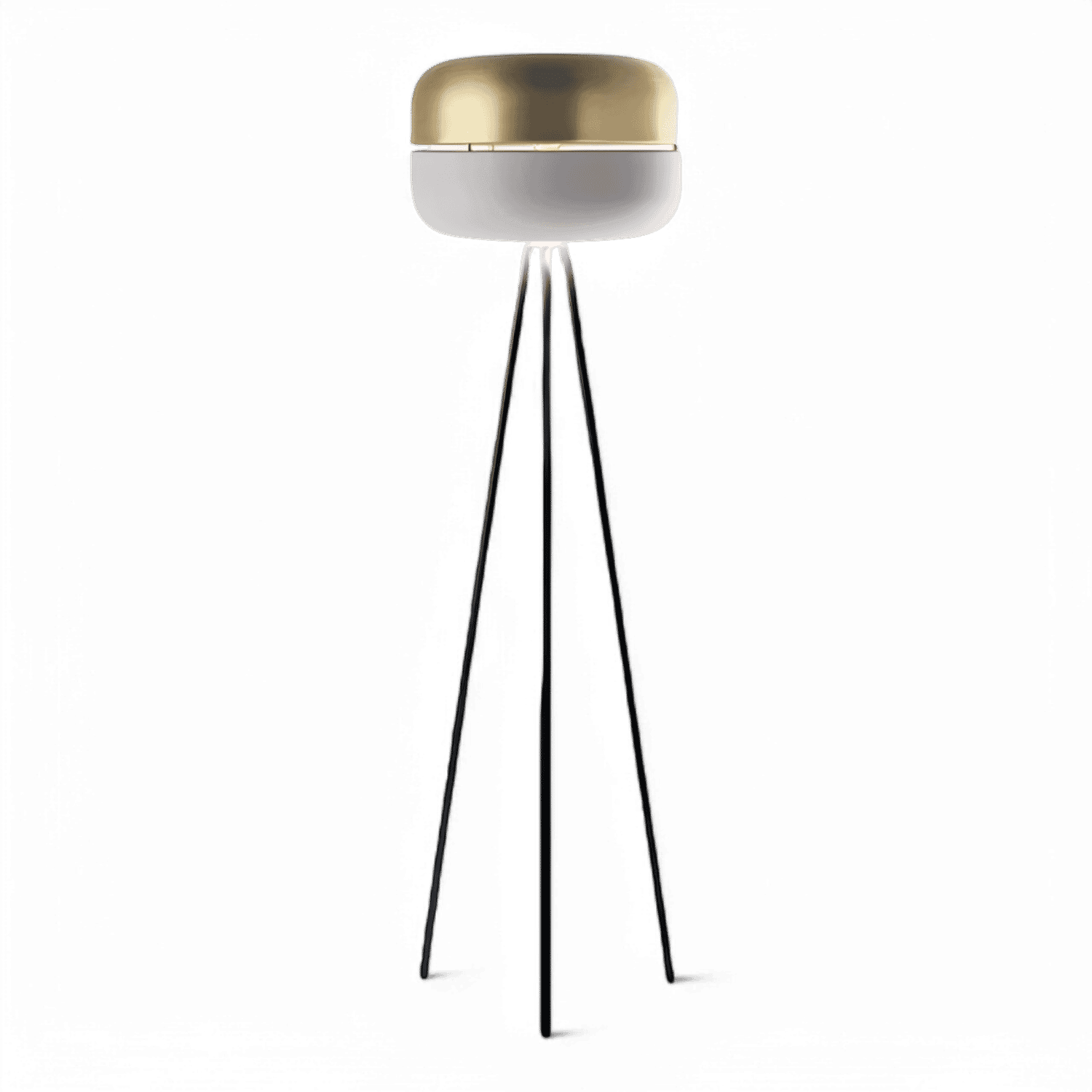 Add elegant attention to your living room with the Alamo Floor Lamp in Matte Gray. This trendy design features two half spheres in matte gray and brushed brass, held together by two small metal brackets. Light is displaced through the small middle opening for glowing illumination. The lamp shade rests on a black coated metal tripod for sound support with a fashion forward approach to design. *Light bulb not included.