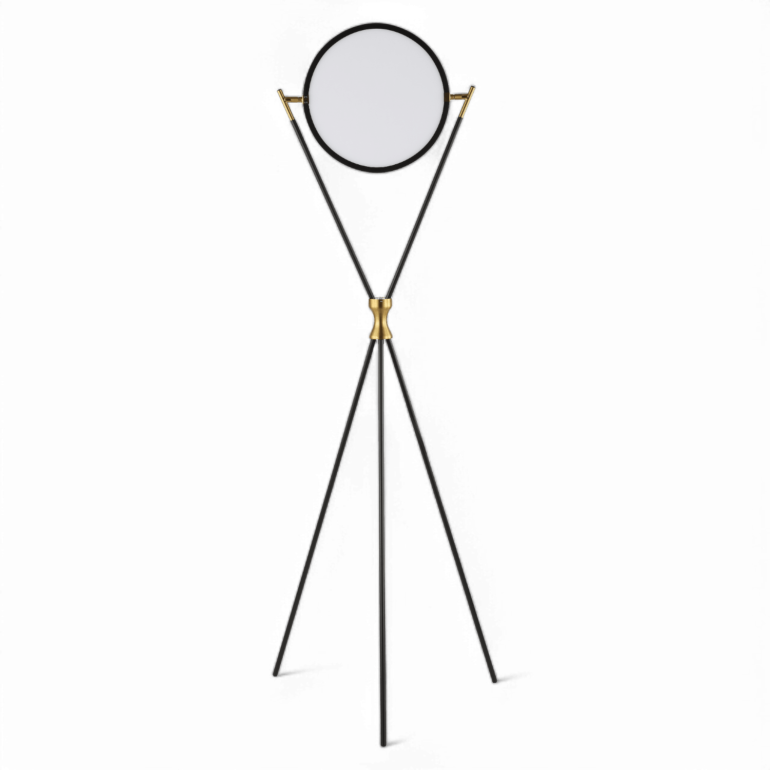 The Eldra Floor Lamp in Black & Gold is a bold and refined lighting fixture with a unique tripod design. Standing around 60 inches high, it features a sleek black frame that elegantly supports a circular light, creating a contemporary silhouette. Gold accents at the pivot points and the central joint add a touch of luxury and warmth, enhancing the lamp's modern appeal. The wide-set tripod legs provide both stability and an airy, open look. Ideal for adding ambient lighting to living rooms, bedrooms, or stylish office spaces, the Eldra Floor Lamp serves as both a functional light source and a striking decorative piece.