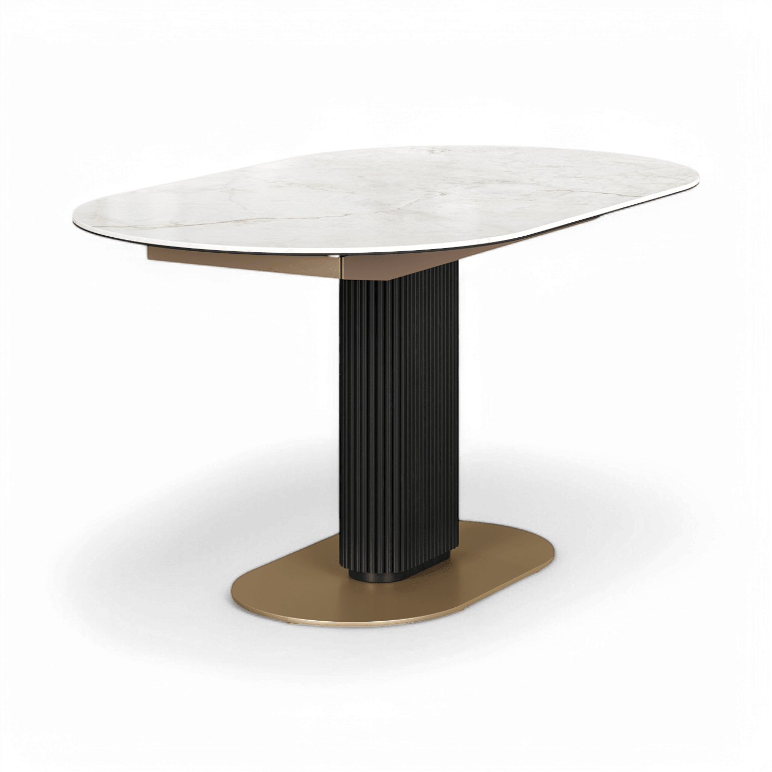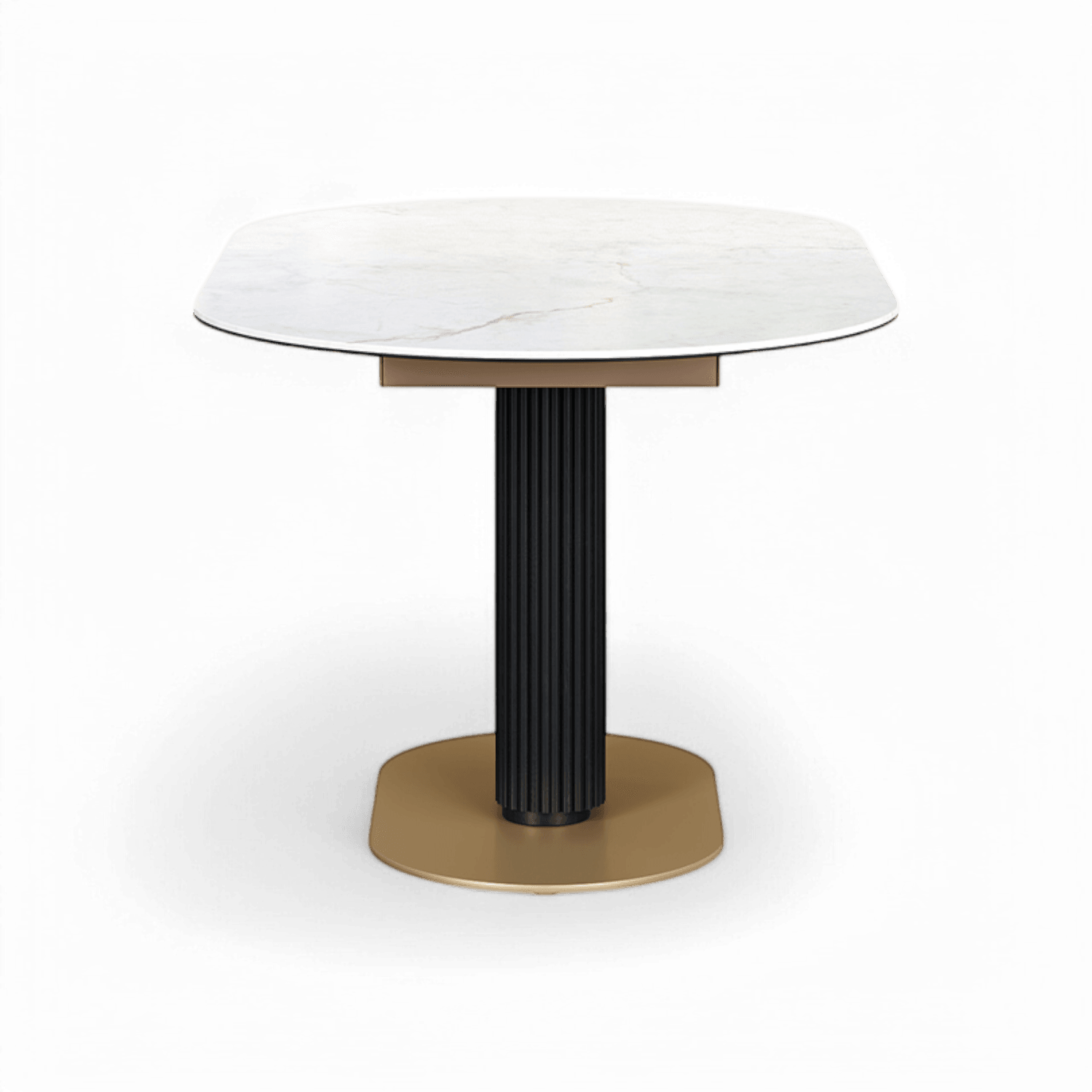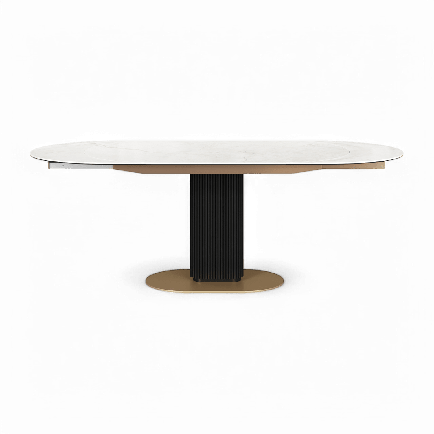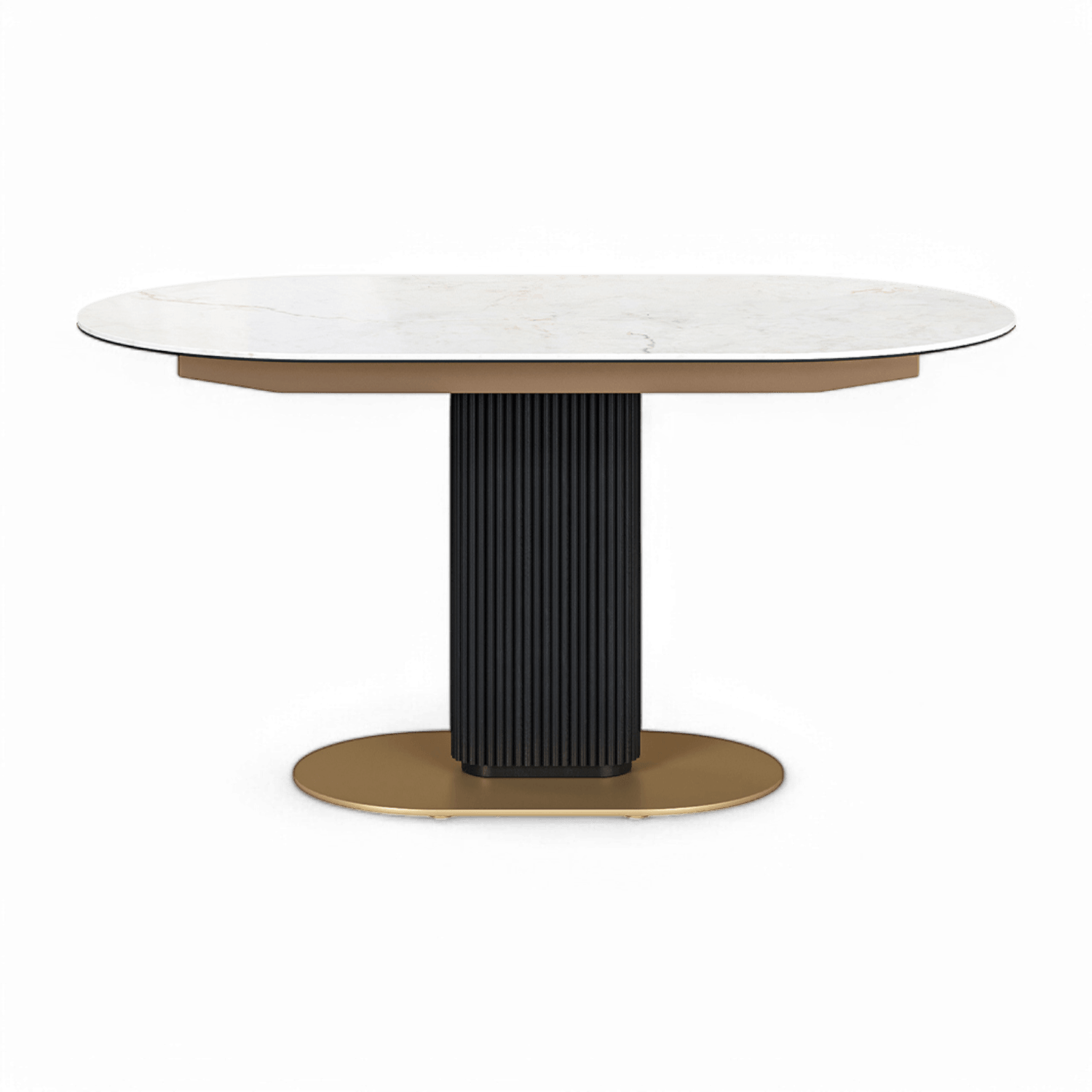 At its core, the pedestal base captivates with fluted strip detailing, elegantly finished in a rich dark oak veneer, adding warmth and texture to the design. Completing the luxurious look, the gold-painted base provides a touch of glamour and stability. Whether hosting an intimate meal or a festive gathering, the Luna Extendable Dining Table seamlessly blends modern elegance with functional design.