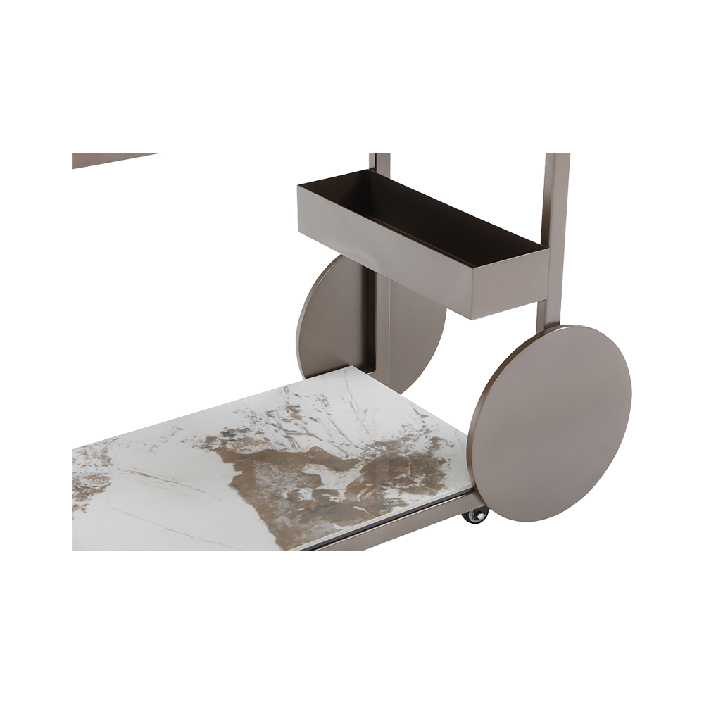 Sleek and sculptural, the Marais Bar Cart combines industrial elegance with luxurious materials. Crafted from steel with a refined bronze powder-coated finish, its minimalist open frame is accented by oversized circular wheels that add a bold, modern statement. The lower tier features a striking 6mm Pandora ceramic surface bonded beneath a 6mm tempered glass, delivering the dramatic veining of natural stone. Effortlessly mobile and undeniably chic, the Marais is the perfect blend of form, function, and contemporary glamour.??