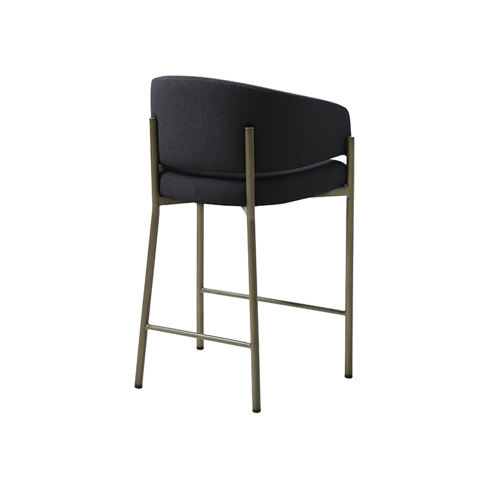 The Oxford Counter Stool features a modern, curved silhouette with plush black fabric upholstery that envelopes the seat and distinctive wraparound back for added comfort and style. The sleek brass-finished metal frame and legs provide an elegant contrast, along with a supportive footrest, making it a sophisticated choice for kitchen islands or bar counters.
