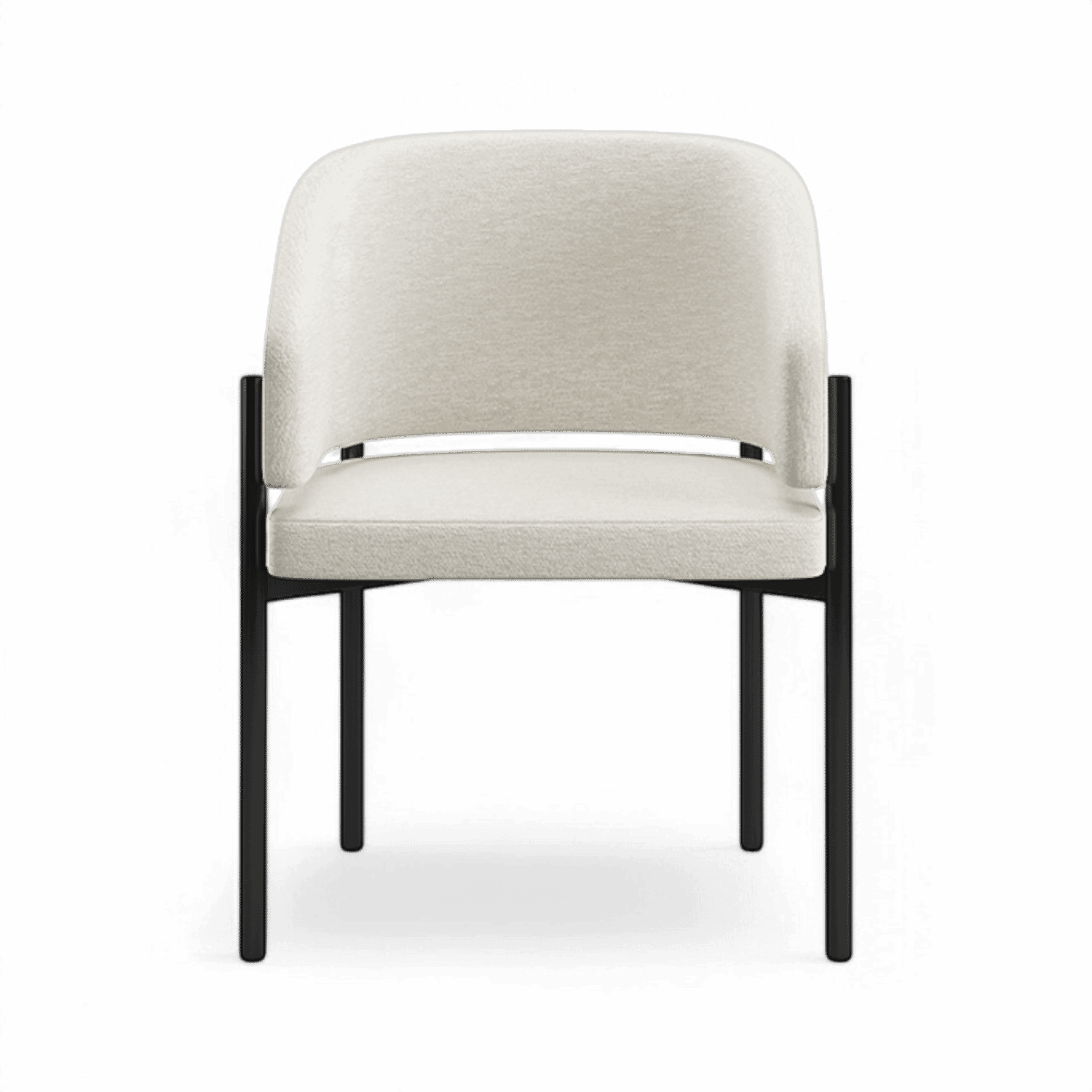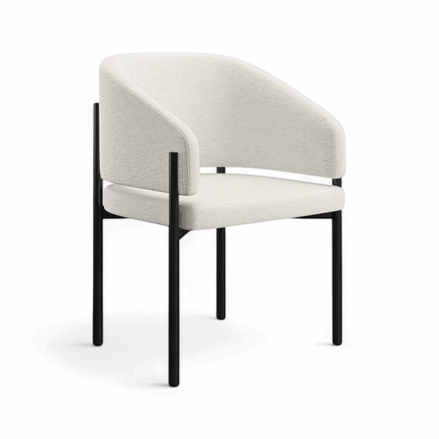 The Oxford Dining Chair features a sleek, modern silhouette with plush off-white fabric upholstery and a slender black metal frame that adds warmth and elegance. Its distinctive curved, enveloping backrest creates a sophisticated yet comfortable dining experience, perfect for contemporary interiors.??