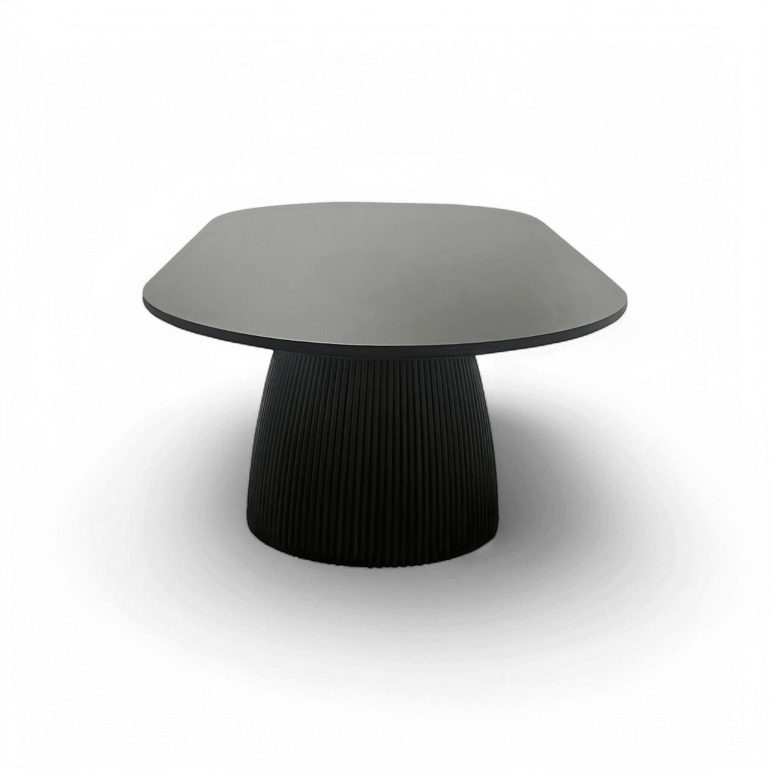 The Oxford Rectangular Dining Table Black Wood is a stunning centerpiece for any dining space, combining modern elegance with timeless craftsmanship. Its sleek rectangular tabletop features gently rounded edges, creating a soft, inviting silhouette. The base showcases a striking vertical wood slat design, adding texture and visual interest to the table's architectural profile.