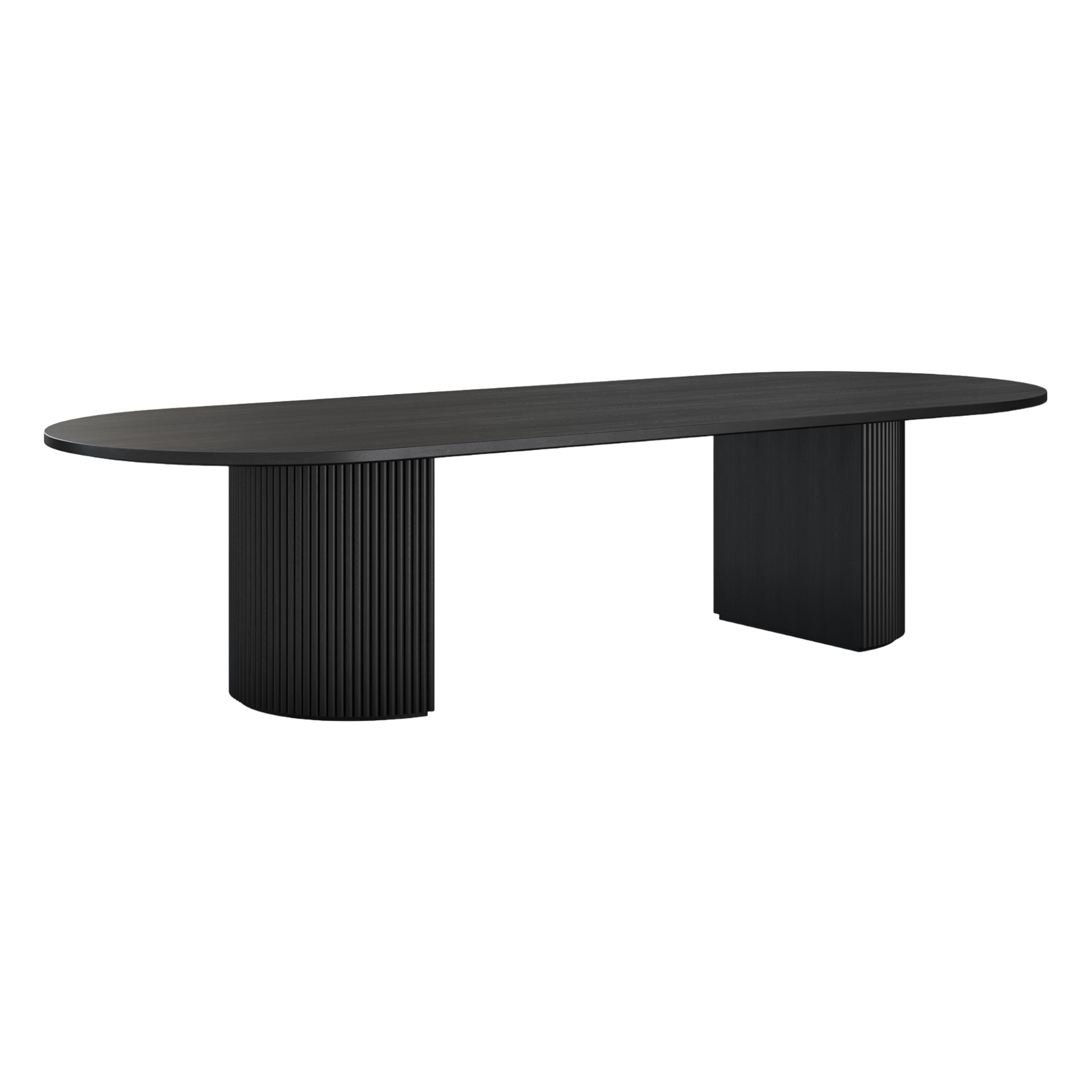 The Oxford XL Rectangular Dining Table Black Wood is a stunning centerpiece for large dining spaces, combining modern elegance with timeless craftsmanship. Its sleek rectangular 130-inch tabletop features gently rounded edges, creating a soft, inviting silhouette. The base showcases a striking vertical wood slat design, adding texture and visual interest to the table's architectural profile.
