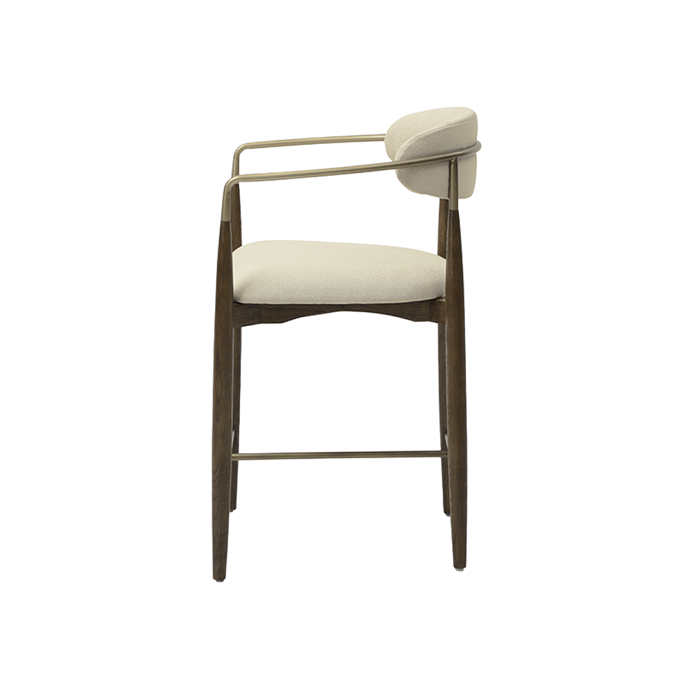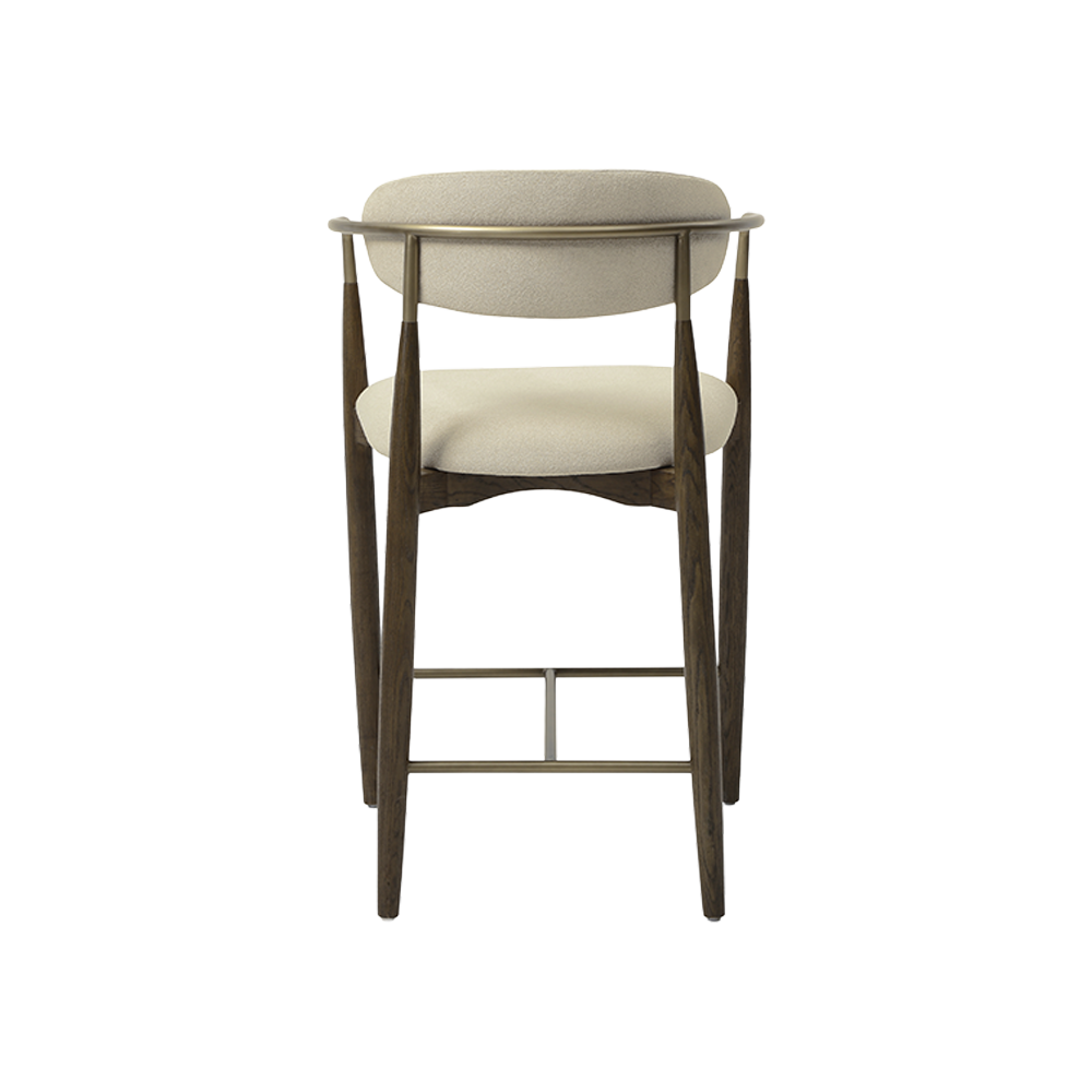 The Sand Counter Stool features a sleek, mid-century-inspired design with elegant comfort for kitchen islands or home bars. Its generously padded seat and distinctive curved, circular backrest are upholstered in a soft, neutral sand-toned fabric, providing supportive cushioning and a subtle textured appeal.?
